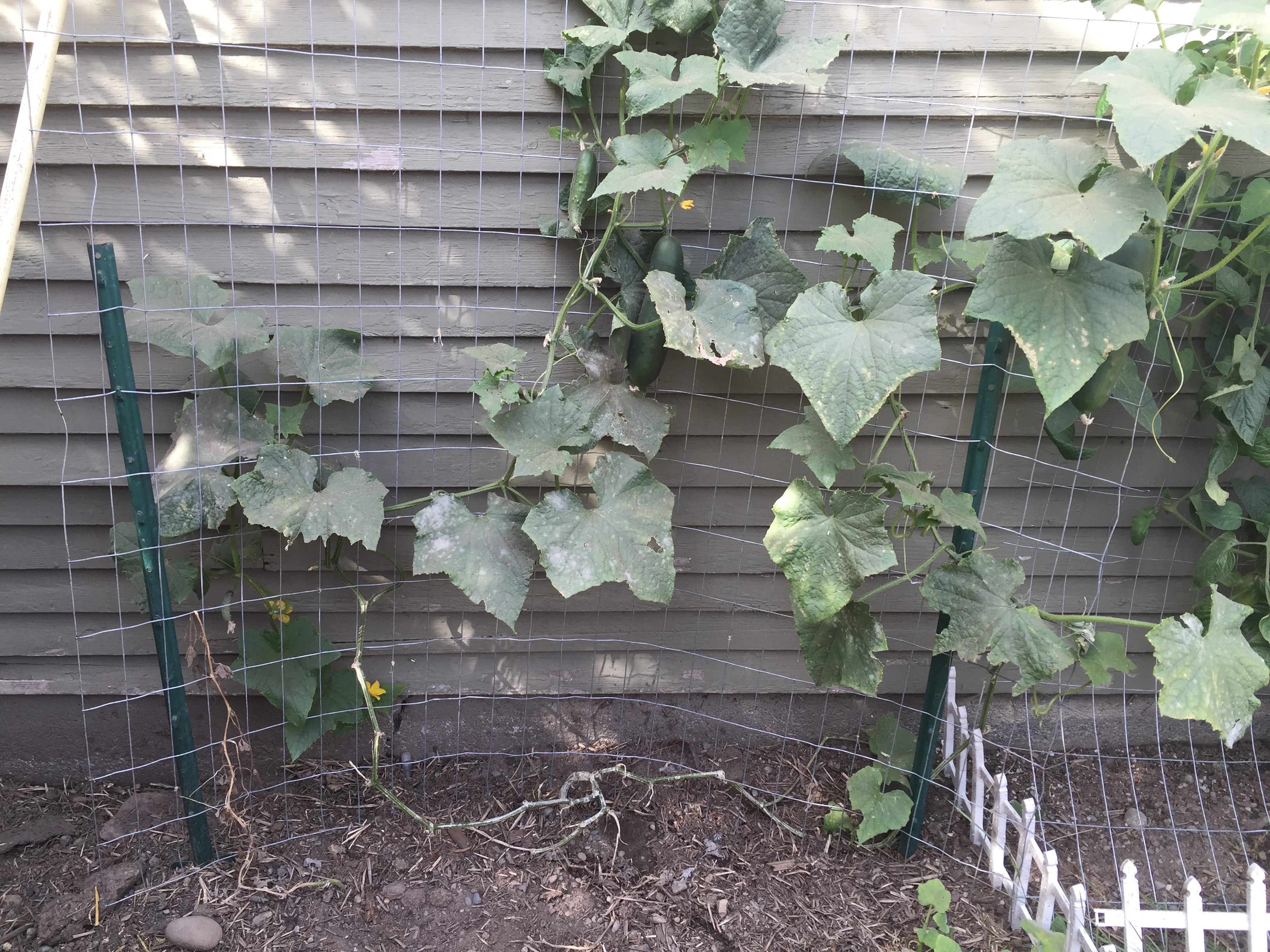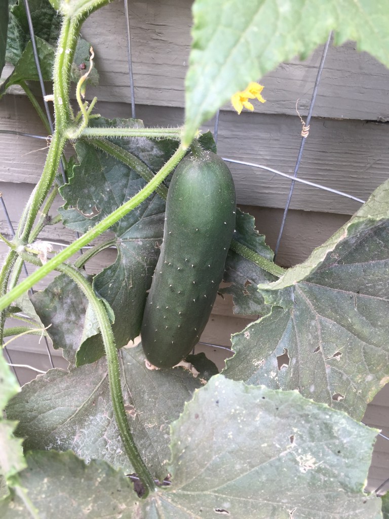Fortunately, she didn’t uproot the plant, and they kept growing. I guess the cucumbers are chicken proof now…