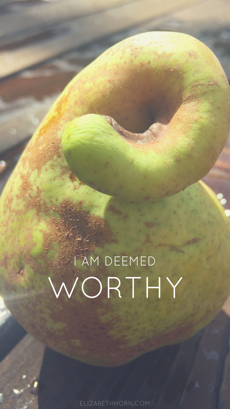 You are just like that pear. I am  just like that pear. Just because I didn’t work out 5 times this week, or had to start taking medicine to control my PCOS, or if I use the iPad as a babysitter so I can sit and enjoy my coffee, because I was too tired to wake up an hour before she did, or because sometimes I’m a b**ch to my husband when he gets home from work, doesn’t mean I’m not worthy. I am worthy.