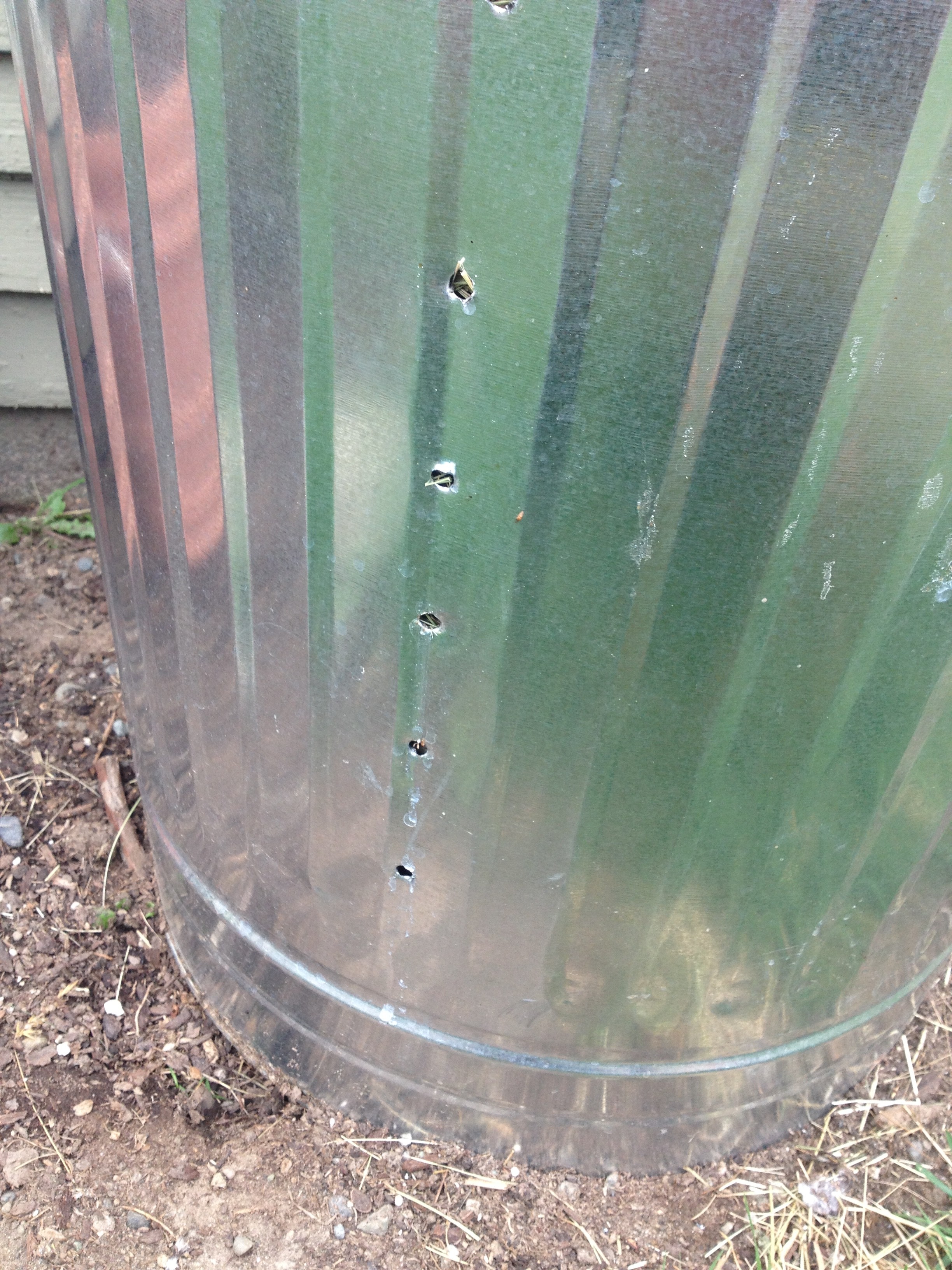 - Begin to drill holes along the sides of the trash can. We drilled from top to bottom (about and inch between each hole) creating four “lines” down the side of the trash can.